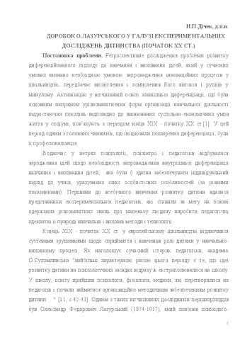 - Дічек, Наталія Петрівна (2011) O.Lazurskogo works in the field of experimental research of childhood (beginning of XX century.) Theory and a training and education (30). pp. 30-38.