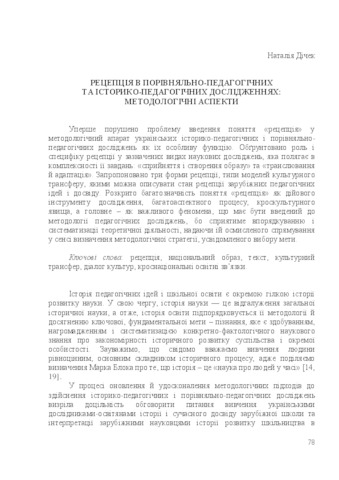 - Дічек, Наталія Петрівна (2015) Reception in comparative educational, historical and educational research: methodological aspects Pedagogy and psychology. Journal of Pedagogical Sciences of Ukraine (2). pp. 78-88. ISSN 2304-0629