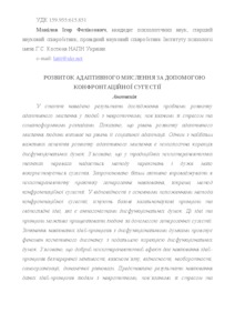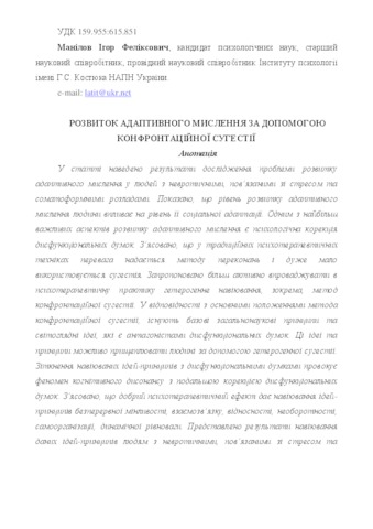 - Манілов, І.Ф. (2016) Development of adaptive intellection by means of confrontation suggestion Технології розвитку інтелекту, 1 (12). ISSN 2223-0521