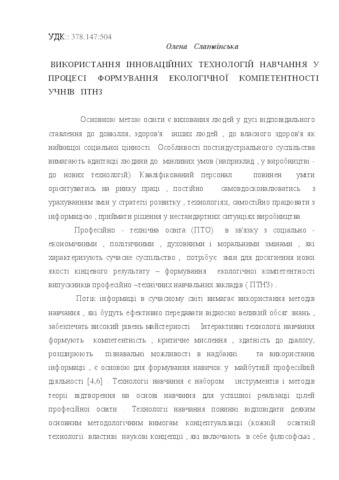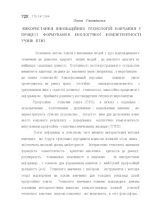 2014 Слатвінська ВИКОРИСТАННЯ ІННОВАЦІЙНИХ ТЕХНОЛОГІЙ НАВЧАННЯ У ПРОЦЕСІ ФОРМУВАННЯ ЕКОЛОГІЧНОЇ КОМПЕТЕНТНОСТІ УЧНІВ ПТНЗ Львів.pdf Download (206kB) | Preview |