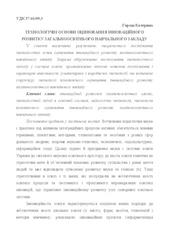 - Гораш, Катерина Вікторівна (orcid.org/0000-0001-8625-9774) (2014) The technological fundamentals for the assessment of the innovative development of a comprehensive educational institution Мистецька освіта: зміст, технології, менеджмент, 9 (65). pp. 350-400. ISSN 2410-4434