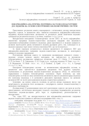 - Спірін, О.М. (orcid.org/0000-0002-9594-6602) and Биков, В.Ю. (2016) Information and analytical support of scientific and pedagogical research bibliometric based electronic systems In: Звітна науков-практична конференція Інституту інформаційних технологій і засобів навчання НАПН України . Інститут інформаційних технологій і засобів навчання НАПН України, м. Київ, Україна, pp. 1-3.