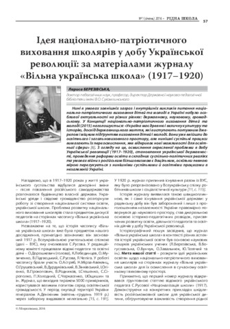 - Березівська, Лариса Дмитрівна (orcid.org/0000-0002-5068-5234) (2016) The Idea of National-Patriotic Education of Schoolchildren in the Ukrainian Revolution Period: on Materials of the Ukrainian Pedagogical Vilna Ukraiinska Shkola Journal (1917-1920) Рідна школа, 1 (1033). pp. 57-62. ISSN 0131-6788