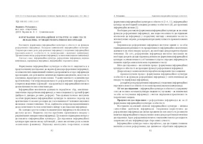 Analyzed the formation of personal information culture as a function of abstract information. The attention is focused on the subject of motivation to seek and verify information. Accented the role of abstract information overcome information overload personality and establishing scientific communication. Lighted the value of the ability to obtain information on their own researchers. The notion of «professional culture of personality» and «information competence». Examined the phenomenon of information overload, media-manipulation and destructive impacts of information. Investigated the formation of a high-level personal information culture as a means to counter the «information of intoxication».