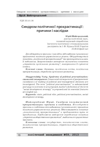 - Шайгородський, Ю.Ж. (2013) Syndrome of political procrastination: causes and consequences Політичний менеджмент (59). pp. 16-29. ISSN 2078-1873