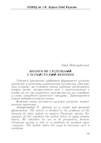 - Шайгородський, Ю.Ж. (2011) Anomie as a social and personal phenomenon Наукові записки ІПіЕНД ім. І.Ф.Кураса НАН України, 4 (54). pp. 19-29.