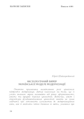- Шайгородський, Ю.Ж. (2012) Axiological dimension of Ukrainian model of modernization Наукові записки ІПіЕНД ім. І.Ф.Кураса НАН України, 4 (60). pp. 14-22.