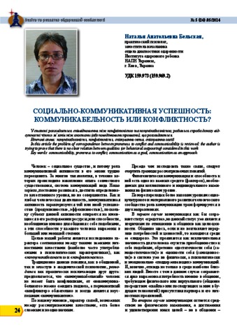 - Бєльська, Н.А. (orcid.org/0000-0003-0697-3973) (2014) Social and communicative successes: communicability and/or proneness to conflict Освіта та розвиток обдарованої особистості, 5 (24). pp. 24-28. ISSN 2309‑3935