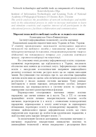 - Коневщинська, О.Е. (2015) Network technologies and mobile tools as components of e-learning Х Міжнародна науково-практична конференція «Нові інформаційні технології в освіті для всіх» ITEA 2015 (26-27 листопада 2015 р.) на базі Міжнародного науково-навчального центра інформаційних технологій та систем, 1 (1). pp. 246-250. ISSN ISВN 978-966-02-7867-7
