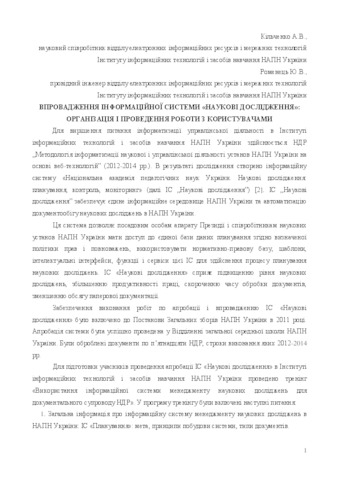 - Кільченко, А.В. and Роменець, Ю.В. (2013) Introduction of the information system «Scientific researches»: organization and leadthrough of work is with users In: Звітна наковова конференція Інституту інформаційних технологій і засобів навчання НАПН України . Інститут інформаційних технологій і засобів навчання НАПН України, м. Київ, Україна, pp. 81-83.