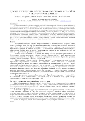 - Задорожна, Н.Т., Кільченко, А.В., Тебенко, Олександр Віталійович and Тебенко, Олексій Віталійович (2006) Experience of leadthrough of Internet-ompetitions: organizational and technological aspects ІНТЕРНЕТ–ОСВІТА–НАУКА – 2006, П’ята міжнародна конференція ІОН–2006, 10–14 жовтня, 2006, 1. pp. 57-60.