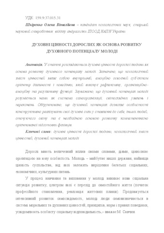 - Шкіренко, Олена Віталіївна (2015) Spiritual values of adults as the basis of spiritual development of young people Освіта дорослих: теорія, досвід, перспективи, 2 (11). pp. 125-132. ISSN 2308-6386