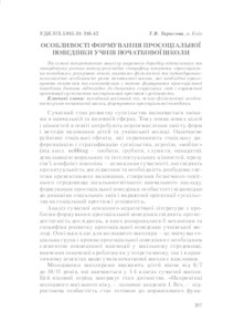Based on a theoretical analysis of scientific achievements of domestic and foreign scholars, the article deals with the specifics of the concept ‘prosocial behavior’. This notion is determined to be interconnected with concepts such as altruism, human relations, relations of solidarity, mutual complicity, humanistic values, formation and development of empathy, differences of prosocial and antisocial behavior. At the same time, according to foreign researchers, prosocial behavior is the action for the benefit of others, and includes sympathy, cooperation, aid, assistance, cooperation. The author emphasizes several theoretical models of prosocial behavior: a decision-making model to assist in crisis situations of Latane and Darl; a prosocial model of Schwartz and Howard; a prosocial behavior model proposed in 2006 by Z. Linderberg that provides five types of behavior: cooperation, fairness, altruism, reliability and respect for the interests of others. The author reveals the formation and personality development stages in the early school years: adaptation (adaptation to new social conditions), individualization (an expression of individual capabilities and characteristics) and integration (inclusion in the peer group). Analysis of psychological and educational literature allowed the author to outline schematically age, anatomical and physiological and individual psychological characteristics of elementary school students that should be considered by teachers and educators in order to develop prosocial behavior according to the dynamics of social change and pronounced orientation of society towards social prestige and successfulness.
