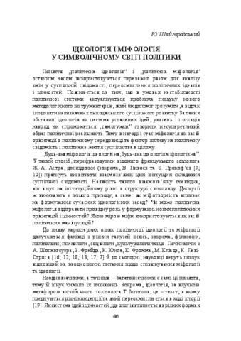 - Шайгородський, Ю.Ж. (2008) Ideology and mythology in the symbolic world of politics Сучасна українська політика. Політики і політологи про неї. Спецвипуск: Політичні технології.