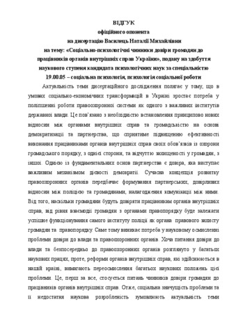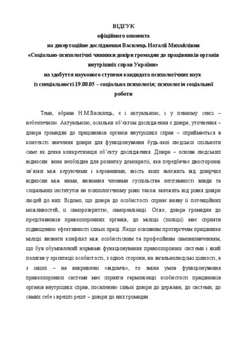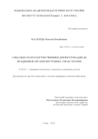 - Василець, Н.М. (2016) Social and psychological factors of trust of citizens to the workers of internal affairs of Ukraine Dissertation candidate thesis, Інститут психології імені Г.С. Костюка.
