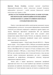 - Кравчина, О.Є. (2013) Досвід застосування мережі School Leaders Network при формуванні інформаційно-комунікаційної компетентності адміністративного персоналу середньої школи в США In: Педагогічна компаративістика – 2013: трансформації в освіті зарубіжжя та український контекст . Педагогічна думка, Київ, м.Київ, Україна, pp. 181-183.