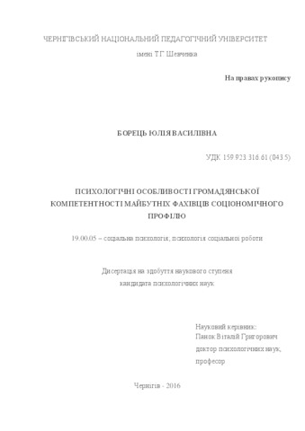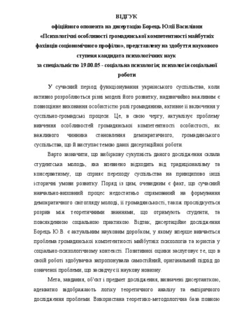 - Борець, Ю.В. (2016) Psychological characteristics of civic competence of future specialists of socionomy professions Dissertation candidate thesis, Чернігівський національний педагогічний університет імені Т.Г. Шевченка.