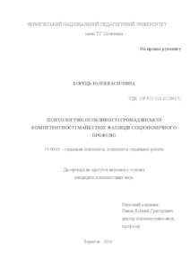 The thesis is devoted to the study of psychological characteristics of civic competence of future specialists of socionomy professions such as a psychologist and a lawyer. It is found that the personality’s self-realization and civic competence as well are mostly associated with human abilities and skills to understand the basic areas of life activity such as legal, moral, economic, environmental. The author presents the theoretical model of civic competence of future specialists of socionomy professions which includes the basic competencies: social and cognitive, normative and regulatory, behavioral and activity. The criteria of forming civic competence of future psychologists and lawyers have been studied empirically. The comparative analysis of the results by sex differences has been done. Correlation ties and dependencies between competencies of civic competence have been determined, social and psychological problems and contradictions have been outlined.