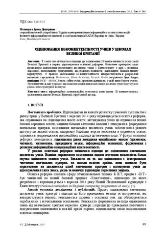 - Малицька, І.Д. (2015) Assessment of pupils’ IT-competence in Great Britain schools Інформаційні технології і засоби навчання, 5 (49). pp. 89-105. ISSN 2076-8184