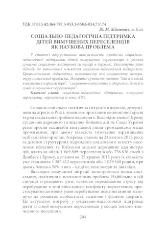 - Жданович, Юлія Миколаївна (orcid.org/0000-0003-1677-189X) (2015) Social-Pedagogic Support for Children of Internally Displaced Persons as a Scientific Problem Теоретико-методичні проблеми виховання дітей та учнівської молоді, 1 (19). pp. 204-213. ISSN 2308-3778