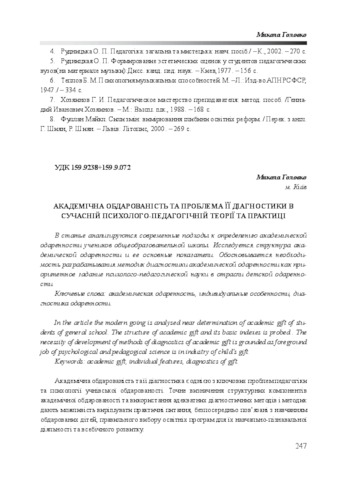 - Головко, Микола Васильович (2011) Academic gift and problem of diagnosis in modern psycho-pedagogical theory and practice Навчання і виховання обдарованої дитини : теорія та практика (5). pp. 247-254.
