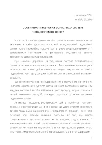 - Ніколенко, Л.Т. (2015) Features of adult education in post-graduate education Особливості навчання дорослих у системі післядипломної освіти:Європейський Союз-Україна: зб.матеріалів Форуму до Міжнародних днів освіти дорослих в Україні (м.Київ, 4-6 листопада, 2014). pp. 156-159.