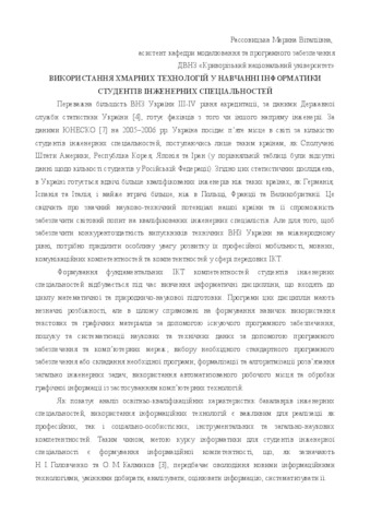 The vast majority of universities Ukraine III-IV level of accreditation, according to the State Statistics Service of Ukraine, trains specialists in a particular direction engineering. According to UNESCO for 2005-2006. Ukraine ranks fifth in the world in the number of engineering students, second only to countries such as United States, South Korea, Japan and Iran (in comparative tables were missing information on the number of students Russian Federation). Under these statistical studies in Ukraine is preparing to double the qualified engineers than countries such as Germany, Spain and Italy, and almost three times higher than in Poland, France and the UK. This indicates a significant scientific and technical potential of our country and its ability to provide global demand for qualified engineering professionals. But in order to ensure the competitiveness of graduates of technical universities in Ukraine at the international level, you need to pay special attention to the development of professional mobility, language, communication competencies and advanced competencies in the field of ICT.