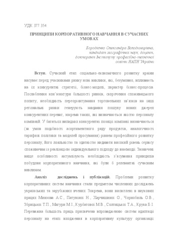 - Бородієнко, О.В. (2015) Prinsiples of Corporate Training in Modern Conditions Науковий вісник Інституту професійно-технічної освіти НАПН України. Професійна педагогіка (10). pp. 11-19.
