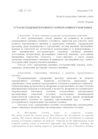 - Бородієнко, О.В. (2015) Current trends in corporate training Професійне навчання на виробництві, 6. pp. 10-18.