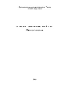 Collected Works "Autonomy and Governance in Higher Education" was prepared for the results of the second phase of research on the same subject in the department of politics and governance in higher education at the Institute of Higher Education NAPS of Ukraine. At this stage, a team of researchers to study the task was to identify and describe existing models of governance and the implementation of autonomy in higher education, to make their comparison and typology. Scientific papers will be useful to job seekers, teachers, researchers, managers of higher education and all natural and legal persons interested in it its development.