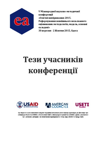 - Козленко, О. Г. (2015) The elimination of teachers statistical inliteracy and the use of educational measurement in schools In: 5th International Research and Methodology Conference Educational Assessment 2015: Reforming Standardized External Testing – Methodology, Model and Core Elements , 5 (5). Альянс Програми сприяння зовнішньому тестуванню в Україні (Альянс USETI), м.Одеса, Україна, pp. 79-80.