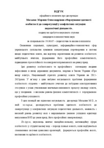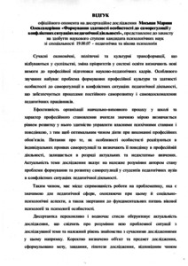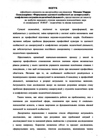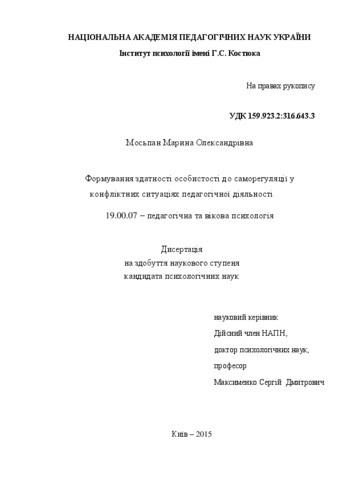 - Мосьпан, М.О. (2015) Formation of the individual’s ability to self-regulation in conflict situations of pedagogical activities Dissertation candidate thesis, Інституті психології імені Г. С. Костюка.