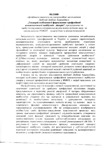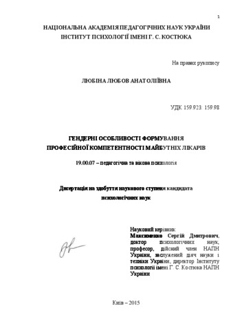 - Любіна, Л.А. (2015) Gender peculiarities of profession competence formation for future doctors Dissertation candidate thesis, Інститут психології імені Г.С. Костюка.