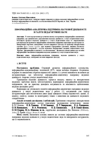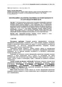 The article deals with the results of the analysis of information and analytical support tools in which takes place scientific activity in the field of educational sciences. The processes of scientific activity in the field of educational sciences are considered and classification information and analytical support tool accordance with these processes are proposed. The benefits of open access electronic systems are singled out on the example to use Open Journal Systems for the conduct the electronic journal of the Institute of Information Technologies and Learning Tools of National Academy of Education Sciences of Ukraine ,,Information Technologies and Learning Tools”. the basic requirements of information and analytical support for of scientific activity in the field of educational sciences are determined there.