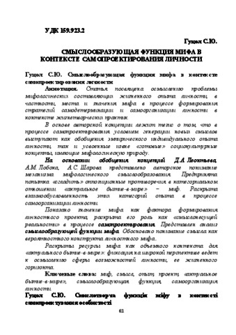 - Гуцол, С.Ю. (2015) The meaning-building function of myth in context of self-designing of personality Актуальні проблеми психології: Збірник наукових праць Інституту психології імені Г.С.Костюка. Психологічна герменевтика, 2 (9). pp. 61-71. ISSN 2072-4772