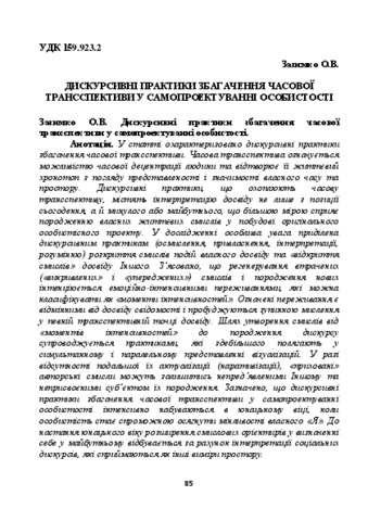 - Зазимко, О.В. (2015) Discursive practices of the time transspective enrichment in the self-designing of a personality Актуальні проблеми психології, 9 (2). pp. 85-105. ISSN 2072-4772