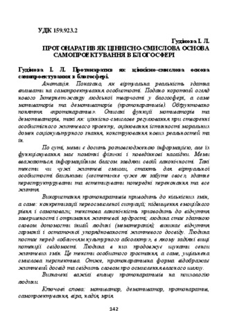 - Гудінова, І.Л. (2015) Protonaratyv as a value-semantic basis for self-projecting in the blogosphere Актуальні проблеми психології, 9 (2). pp. 142-155. ISSN 2072-4772
