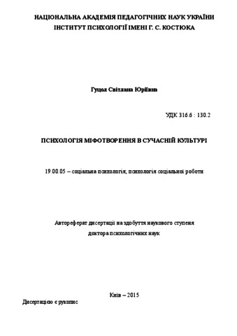 - Гуцол, С.Ю. (2015) Psychology of myth-building in contemporary culture Other thesis, Інститут психології імені Г.С. Костюка.