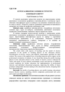 The article deals with aspects of teaching and the model of elective component of the profile of teaching physics in the education district. Classification of elective courses and didactic requirements specified for their content. The essence of the applied focus of teaching material and its impact on the professional orientation of students. It was found that during the profile learning physics in the education district in the content of elective courses reflected the values and needs of rural cultural environment, needs and interests of children, created conditions for further education, the implementation of professional interests and individual educational programs, improving the ability of future graduates independent decision-making in the educational market, designing their own educational path.