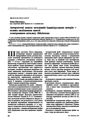 | Keywords: | authority control, authority files, authority records, individual authors, electronic catalogues, bibliographic record, Sukhomlynskyi State Scientific and Pedagogical Library of Ukraine. |