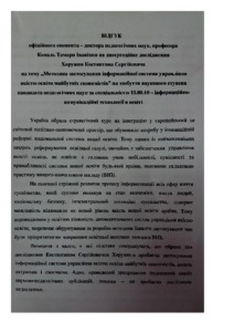 Диссертация на соискание ученой степени кандидата педагогических наук по специальности 13.00.10 – информационно-коммуникационные технологии в образовании. – Институт информационных технологий и средств обучения НАПН Украины, Киев, 2015. В работе исследуется проблема формирования методики использования информационной системы управления качеством образования будущих экономистов. В первом разделе освещены исторические, философские и психолого-педагогические аспекты развития экономического образования в Украине, охарактеризованы современные требования к управлению качеством образования будущих экономистов в контексте отечественного и мирового опыта и приведены результаты анализа исследований по проблемам управления качеством образования на основе информационных технологий. Проведенный анализ позволил определить психолого-педагогический, исторический и философский аспекты исследования. Предложено определение понятия „качество образования будущих экономистов“. Было определено, что управление качеством образования целесообразно рассматривать как выполнение функций регулирования путем установления норм качества образования, осуществление надзора, контроля и принятия мер по соблюдению установленных норм и осуществление мероприятий по совершенствованию элементов системы образования. Доказано, что создание системы управления качеством образования на национальном уровне в рамках евроинтеграционных стремлений Украины в контексте требований к участию в Болонском процессе предполагает выработку стандартов, норм и требований к общеуниверситетским системам управления качеством образования.