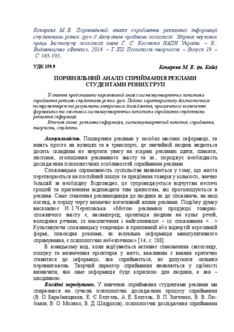 - Кокарєва, М. В. (2014) Comparative analysis of advertisement perception by students of different groups Актуальні проблеми психології.- Т. ХІІ. Психологія творчості, 19. pp. 185-193. ISSN 2072-4772