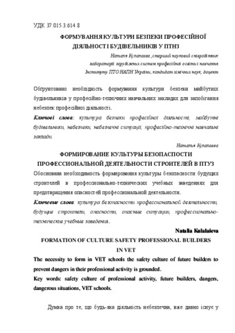 - Кулалаєва, Наталя Валеріївна (orcid.org/0000-0002-8613-1495) (2015) Formation of culture safety professional builders in VET Професійно-технічна освіта, 2 (67). pp. 10-13.