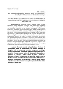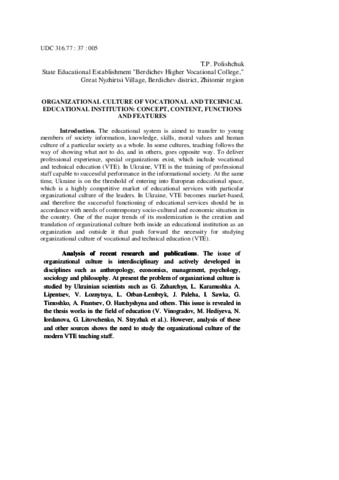 - Поліщук, Тетяна Петрівна (2015) Organizational culture of vocational and technical educational institution: concept, content, functions and features Edukacja –Technika – Informatyka: Kwartalnik naukowy, 2 (12). pp. 112-116.