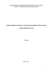 In a manual theoretical bases are analysed and the features of forming for the students of educational institutions of readiness are exposed to the choice and realization of professional career, the ways of development of their pictures are lighted up of professional success. Considerable attention is spared descriptions of forms and methods of forming of readiness of students of educational institutions to the choice and realization of professional career. In a manual considered the feature of samorazvitiya of future skilled specialists in the context of problem of forming of readiness to planning of professional career, the model of forming of readiness of students of professional'no-tekhnicheskikh educational establishments is resulted to professional-personality samorazvitiyu and development of professional career, method of diagnostics of samorazvitiya of students of professional'no-tekhnicheskikh educational establishments. Forms and methods of forming of social-professional competence of students of educational institutions and monitoring of its formed are also considered in-process.