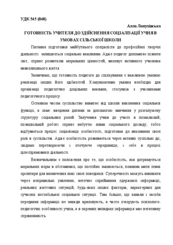 - Лопухівська, Алла Василівна (2009) The teacher’s willingness for the pupil’s socialization fulfillment under conditions of the rural school Психолого-педагогічні проблеми сільської школи, 2 (31). pp. 38-43.