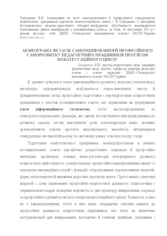 - Сидоренко, В.В. (2015) Akmeogramma as a tool of self-evaluation and self-teaching professional staff during the cycle between certifications In: Матеріали Всеукраїнської науково-практичної інтернет-конференції «Особливості впровадження Національної рамки кваліфікацій у післядипломну освіту» Освіта дорослих . ДВНЗ "Університет менеджменту освіти", м.Київ, Україна, pp. 23-26.