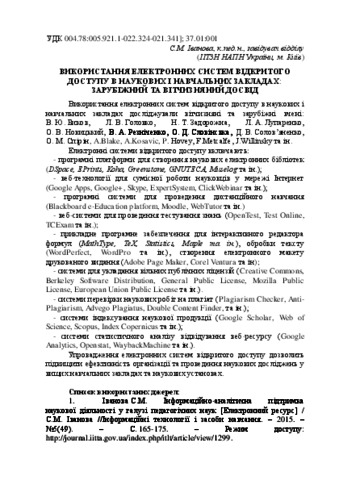 - Іванова, С.М. (2015) The use of electronic systems of open access in scientific and educational institutions: foreign and domestic experience In: Мультимедійні технології в освіті та інших сферах діяльності . Національний авіаційний університет, м.Київ, Україна, pp. 40-41.