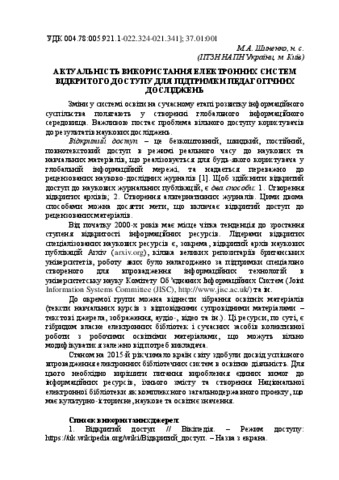 - Шиненко, М.А. (2015) The urgency of the use of electronic systems to support open access educational research In: Мультимедійні технології в освіті та інших сферах діяльності . Національний авіаційний університет, м.Київ, Україна, pp. 111-112.
