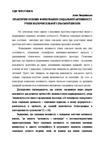 - Лопухівська, Алла Василівна (2012) Practical basics development of social activity of the rural school pupils Педагогічна освіта: теорія і практика, 10. pp. 266-270.